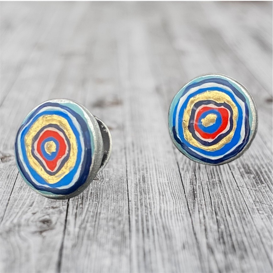 Kézzel festett, gyanta bevonatú 1,5 cm átmérőjű beszúrós fülbevaló. Nemesacél fémrészekkel, antiallergén kivitelben. Színes, vidám, művészet ihlette kiegészítő különleges alkalmakra és hétköznapokra.