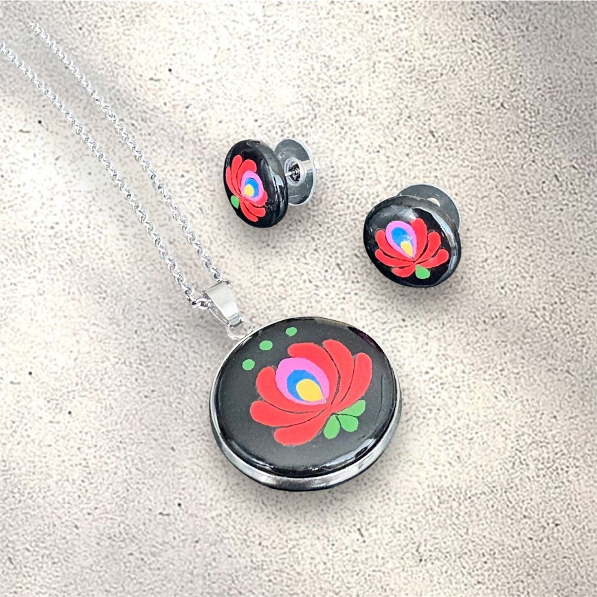 Kézzel festett, gyanta bevonatú ékszerszett, mely a hagyományos magyar népi virágmotívumok szín- és formavilágát idézi. A szett része egy 1,5 cm átmérőjű beszúrós fülbevaló és egy kerek medál (2,5 cm átmérő). Nemesacél fémrészekkel, antiallergén kivitelben. Egyedi kiegészítő, amely ötvözi a népművészet hagyományát a modern, elegáns megjelenéssel.