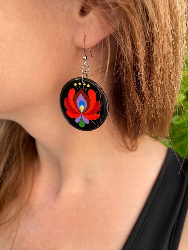 Kézzel festett, gyanta bevonatú fülbevaló, amely a hagyományos magyar népi virágmotívumok színeit és formavilágát idézi meg modern, elegáns megjelenésben. Átmérője 3 cm. Nemesacél fémrészekkel készült, antiallergén kivitelben.