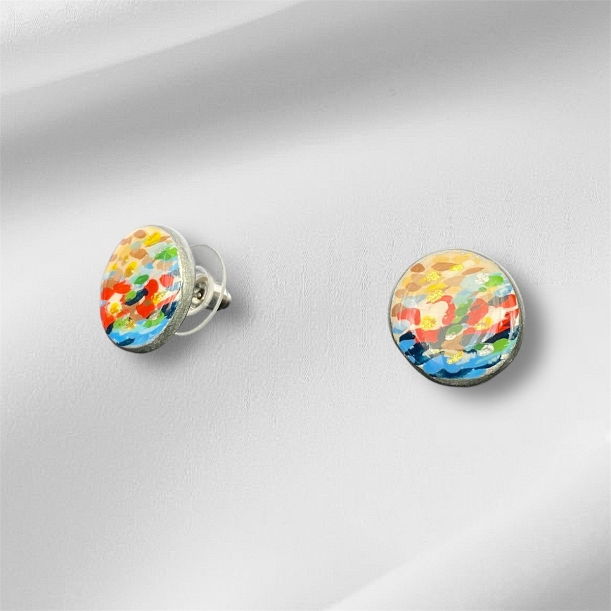 Kézzel festett, gyanta bevonatú 1,5 cm átmérőjű beszúrós fülbevaló, melynek színei Monet tavirózsás világát idézik elvont formában. Nemesacél fémrészekkel, antiallergén kivitelben.