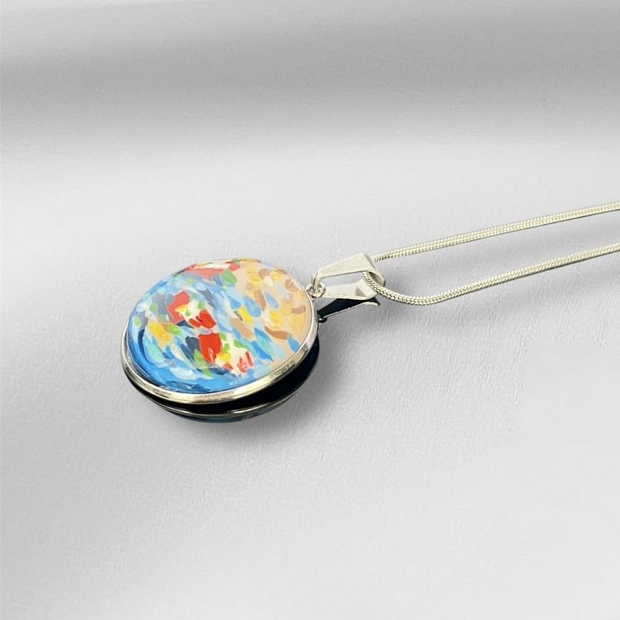 Kézzel festett, gyanta bevonatú 2,5 cm átmérőjű medál, melynek színei Monet tavirózsás világát idézik elvont formában. Nemesacél fémrészekkel, antiallergén kivitelben.