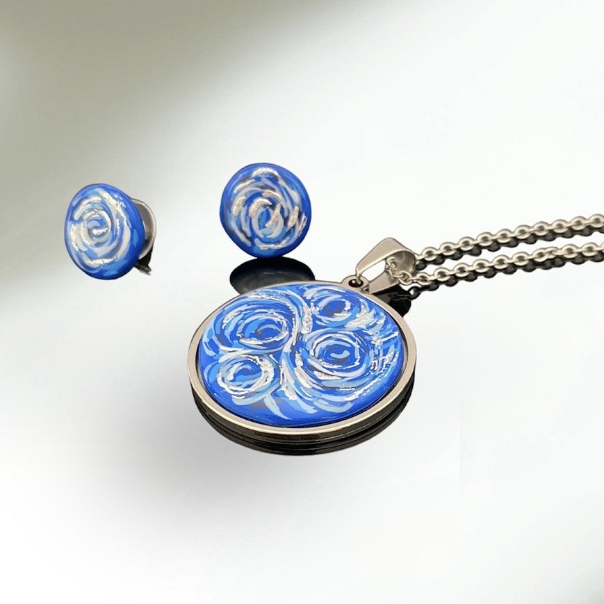 Kézzel festett, gyanta bevonatú kerek medál (2,5 cm átmérő) és hozzá illő beszúrós fülbevaló. (1,5 cm átmérő) Nemesacél fémrészekkel, antiallergén kivitelben.