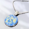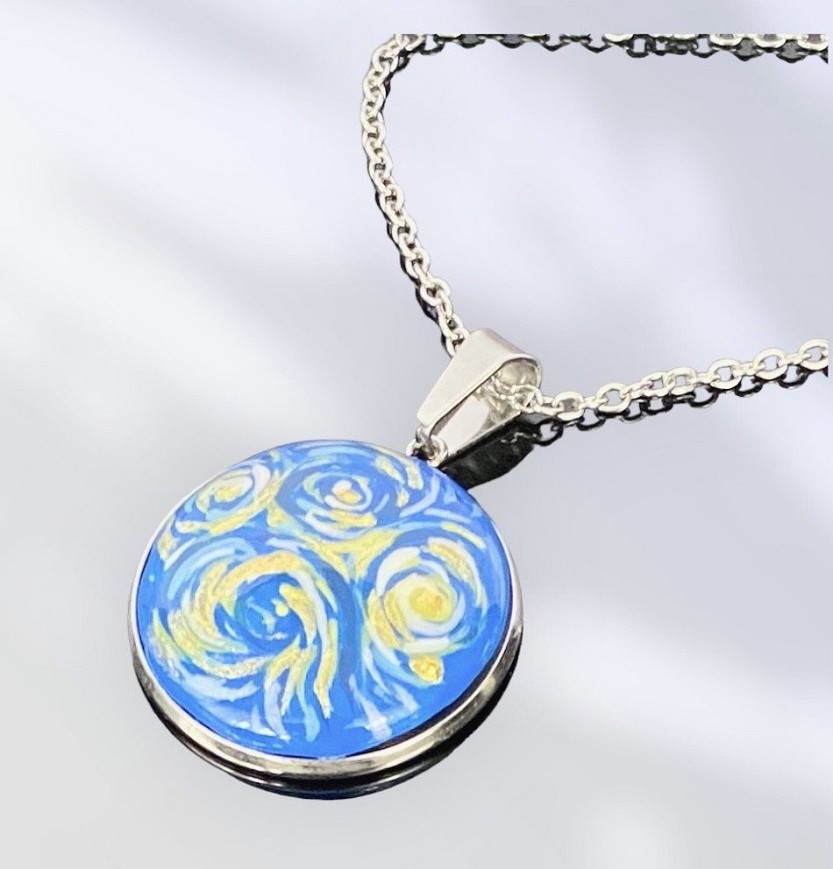 Kézzel festett, gyanta bevonatú 2,5 cm átmérőjű medál, melynek mélykék árnyalatai Van Gogh világát idézik, elegáns és időtlen kiegészítőként. Nemesacél fémrészekkel, antiallergén kivitelben.